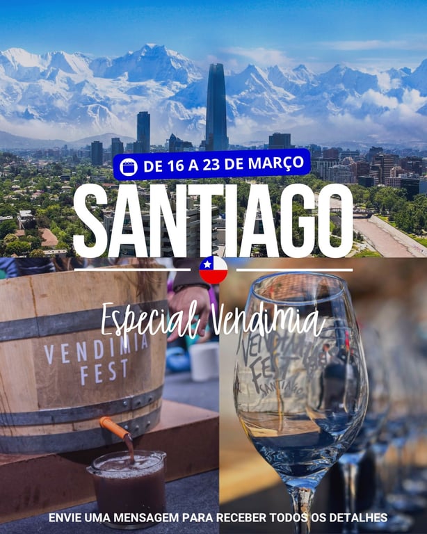 Descubra o romance e a cultura do Março Chile Vendimias 2026 em Santiago, com vinícolas históricas, degustações de vinho e uma vibrante vida noturna! Chegada dia 16 Noite para descansar e começar a viagem no dia seguinte. Itinerário aberto sem tour (solicita serviços separados)