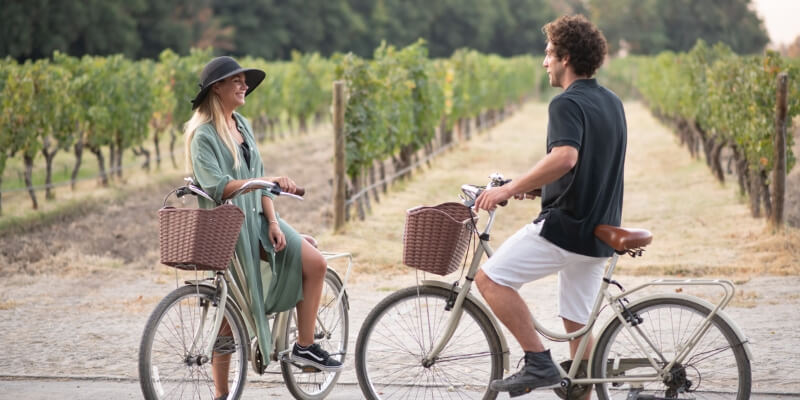 Um passeio de bicicleta pelos vinhedos e tanque de irrigação. Os turistas visitarão as adegas